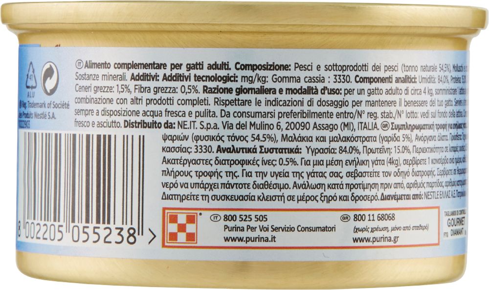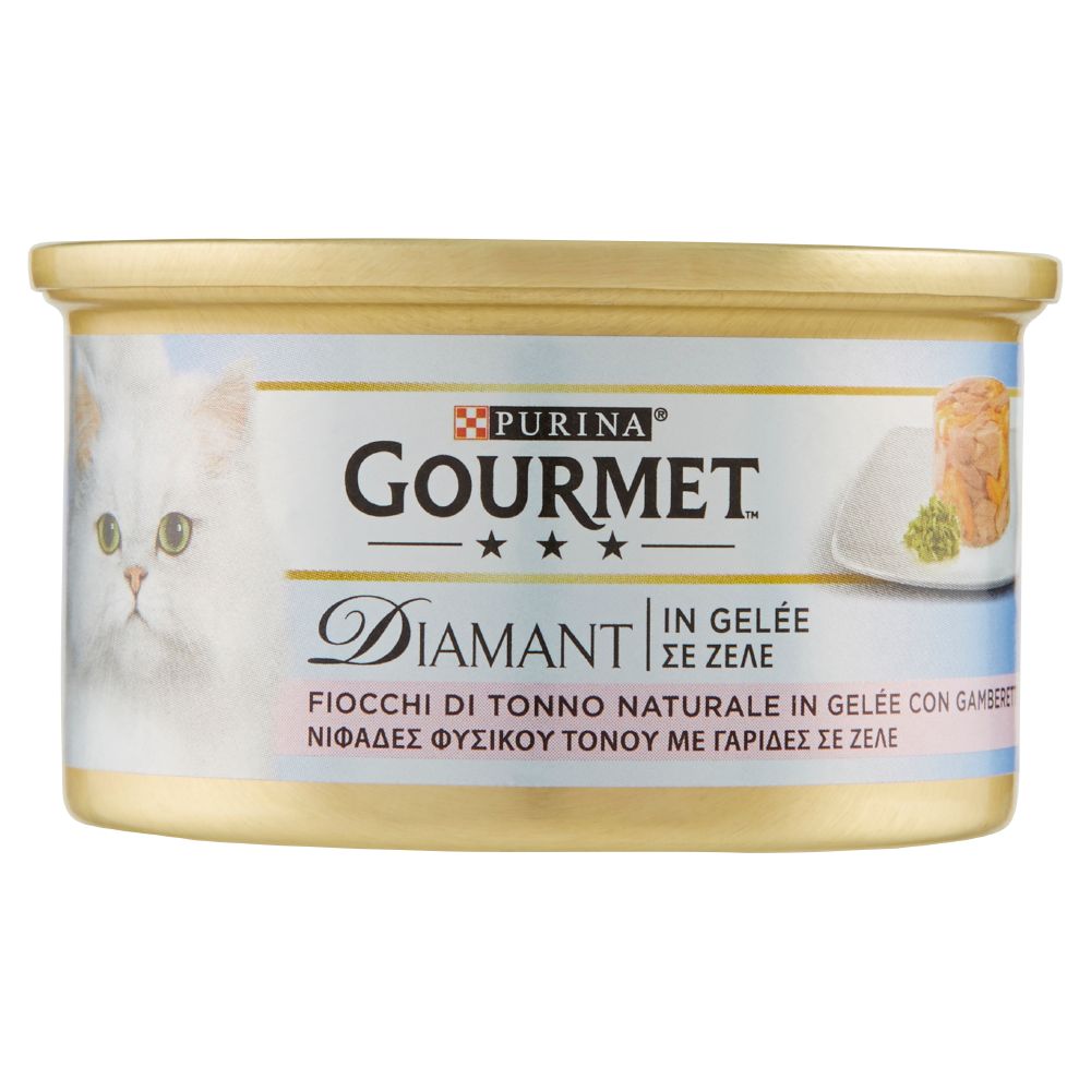 Salta e vai al contenutoPurina, gatto Gourmet Diamant Fiocchi di tonno in gelée con gamberetti lattina 85 g